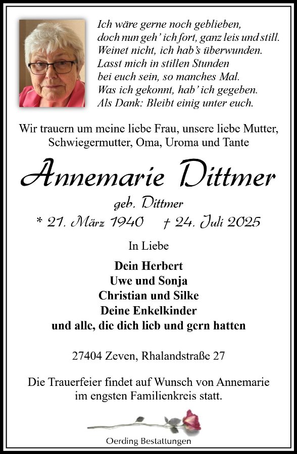 Hiermit spreche ich Euch mein aufrichtiges Beileid zum Tode Eurer Ehefrau, Mutter, Großmutter, Urgroßmutter und Tante Annemarie aus.