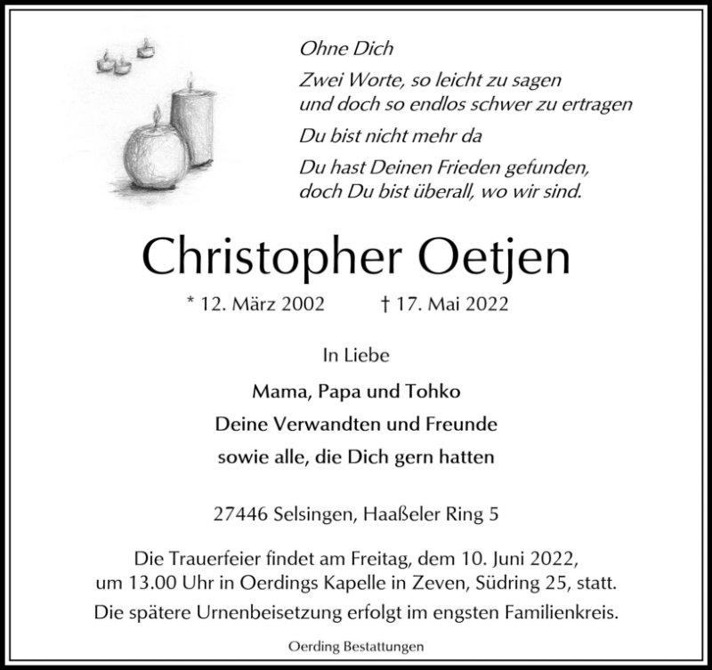 Liebe Pris, lieber Klaus, liebe Thoko Mir fehlen einfach die Worte... Das Schlimmste was ein Mensch erfahren kann ist nun geschehen. Ein Kind/ Bruder so früh zu verlieren ist unvorstellbar! Ich werde Christopher in guter Erinnerung behalten er war stets ein lieber, freundlicher und fröhlicher Junge. Unbegreiflich ihn nicht mehr wiederzusehen. Mein aufrichtiges Mitgefühl gilt euch und eurer Familie. Ich wünsche Euch viel Kraft und Zuversicht in dieser schweren Zeit der Trauer. Ich bin für euch da... Miriam