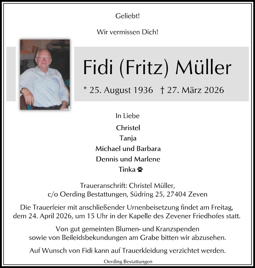 In stiller Anteilnahme und in Erinnerung an unseren Nachbarn Fidi.Karin FietzBianca FietzNatascha Holsten