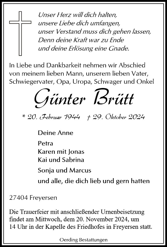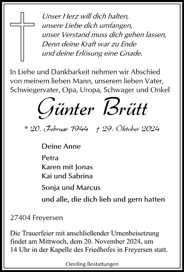Liebe Familie Brütt,Alles verändert sich, aber dahinter ruht einEwiges.GoetheHerzliche Anteilnahme Christiane Schiemann