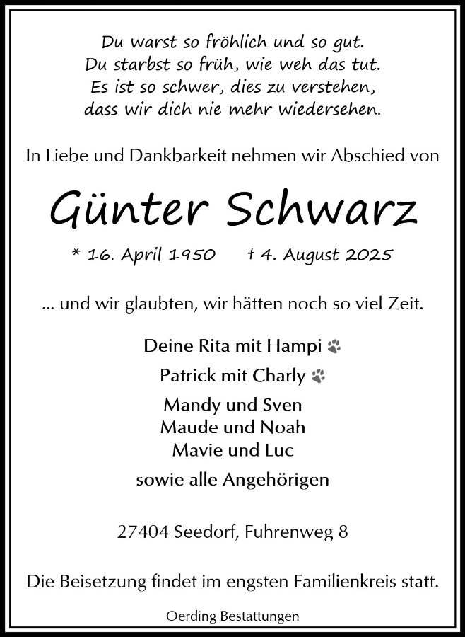 Liebe Rita und Fam,habe gerade erfahren das mein ehemaligerkahrelanger Arbeitskollegen Günter verstorben ist.Ich möchte euch hiermit mein aufrichtiges Beileid Aussprechen Ich wünsche euch das ihr diese schweren Tage gut übersteht ,bleibt gesund und herzliche Grüße aus Drochtersen Werner Hartlef