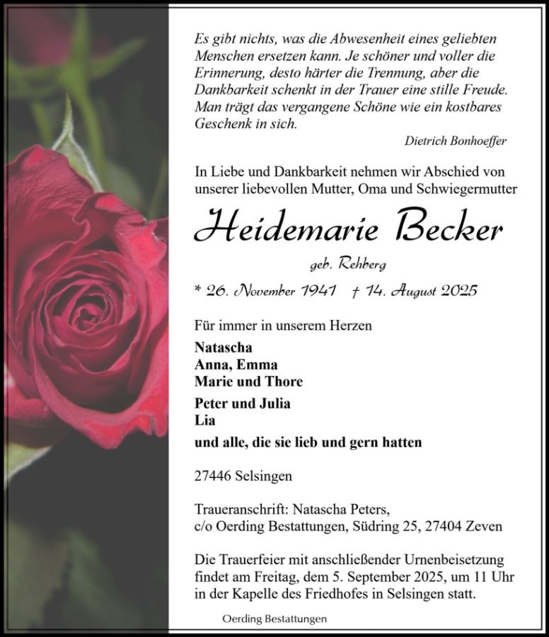 Ich muss oft über Heidemarie und euch nachdenken. Auch wenn ich sie nicht sehr lange kannte bin ich glücklich, dass ich sie noch kennenlernen durfte.