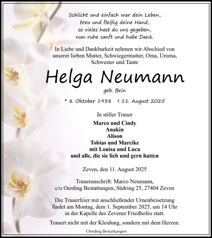 wenn das Lachen noch leise in unseren Ohren klingt, das Bild in uns noch leuchtet, und man die Liebe noch im Herzen spürt, dann huscht ein kleines dankbares Lächeln über unser Gesicht, denn unsere liebe (Tante) Helga ging nur schon vorweg und wollte nicht alleine sein, so gingen sie zu Zweien. Und ein Jeder denkt leise für sich: "Danke, dass du da warst, du fehlst unendlich"! Ich wünsche euch weiterhin viel Kraft und Platz für schöne Erinnerungen im Herzen.