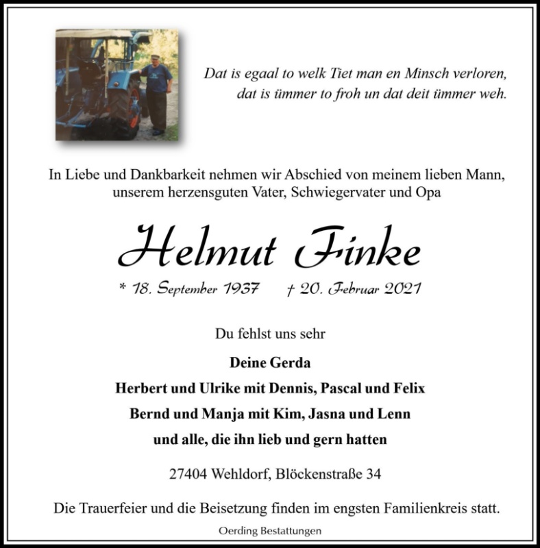 geboren am 18. September 1937 in Wehldorf gestorben am 20. Februar 2021 in Tarmstedt