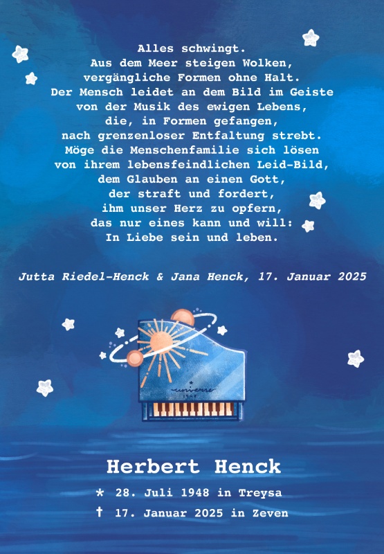 Ich fragte ihn wenige Tage vor dem 17. Januar nach seinem Wunsch, und er sprach im Schweigen zu mir, um der von mir angebotenen stillen Seebestattung mit keinem Hauch zu widersprechen.