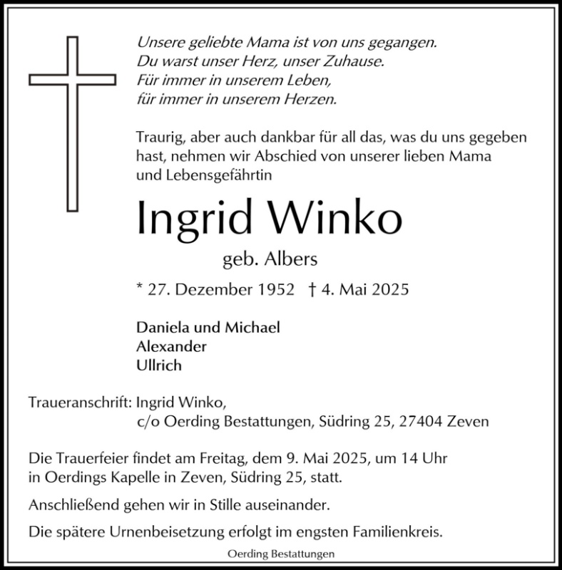 Wir erinnern uns gerne an die liebe Ingrid. Sie war uns eine nette Kollegin. Wir möchten euch unser Beileid aussprechen. Mit stillem Gruß Die Kollegen vom Zevener Wochenmarkt