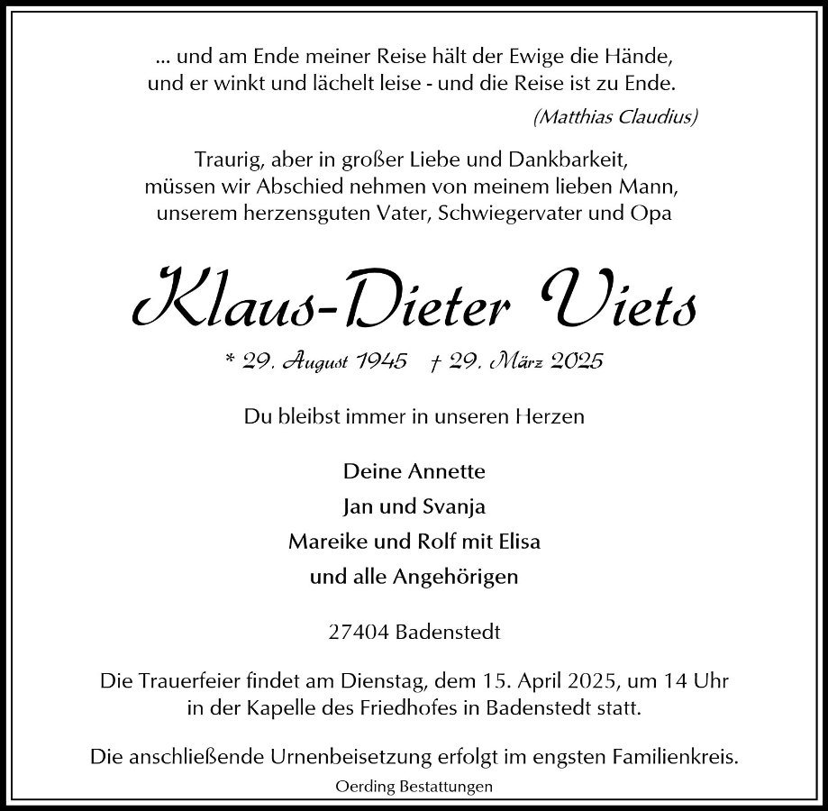 geboren am 29. August 1945 in Badenstedt gestorben am 29. März 2025 in Bremervörde