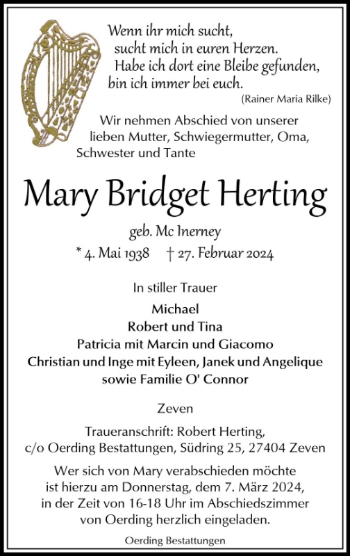 geboren am 4. Mai 1938 in Clare/Irland gestorben am 27. Februar 2024 in Rotenburg (Wümme)