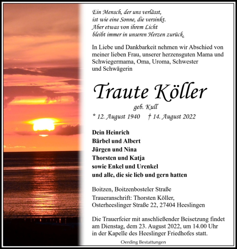 Aber auch wenn es schwerfällt, darf man darauf vertrauen, dass die Zeit Ihre eigene zarte Art besitzt, Wunden zu berühren - nicht auszulöschen, aber erträglicher zu machen. Trauer verändert sich, wird weicher und erinnert uns, statt uns zu zerbrechen. Und eines Tages merkst du, dass der Schmerz nicht mehr alles einnimmt, weil die Liebe, die uns verbindet größer war, als jeder Abschied.