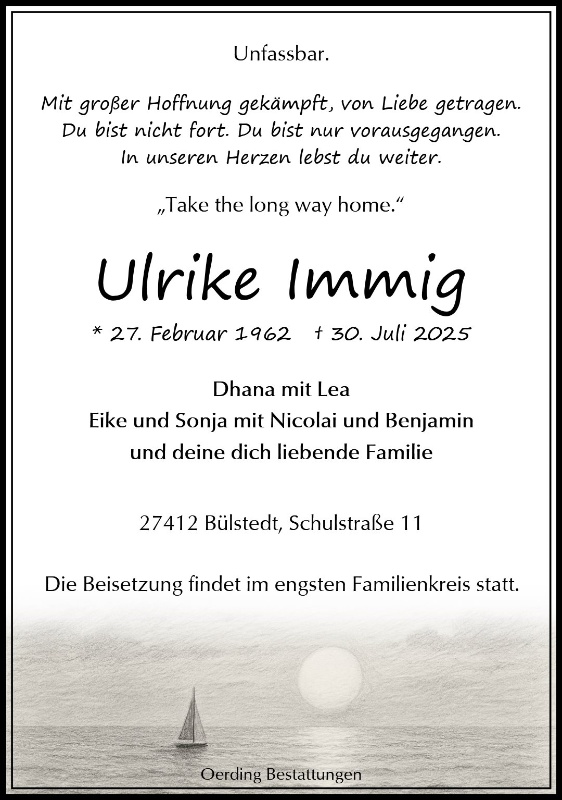 Ulrike, es wird anders. Wir verlieren nicht den Mut. Du bist immer bei uns. Ich habe dich lieb und denke an dich.